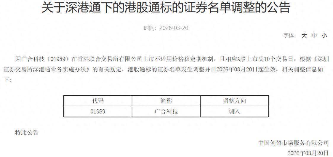 智通财经APP获悉,深交所公告,因广合科技(01989)在香港联合交易所有限公司上市不适用价格稳定期机制,且相应A股上市满10个交易日,根据《深圳证券交易所深港通业务实施办法》的有关规定,港股通标的证券名单发生调整并自2026年03月20日起生效,调入广合科技。